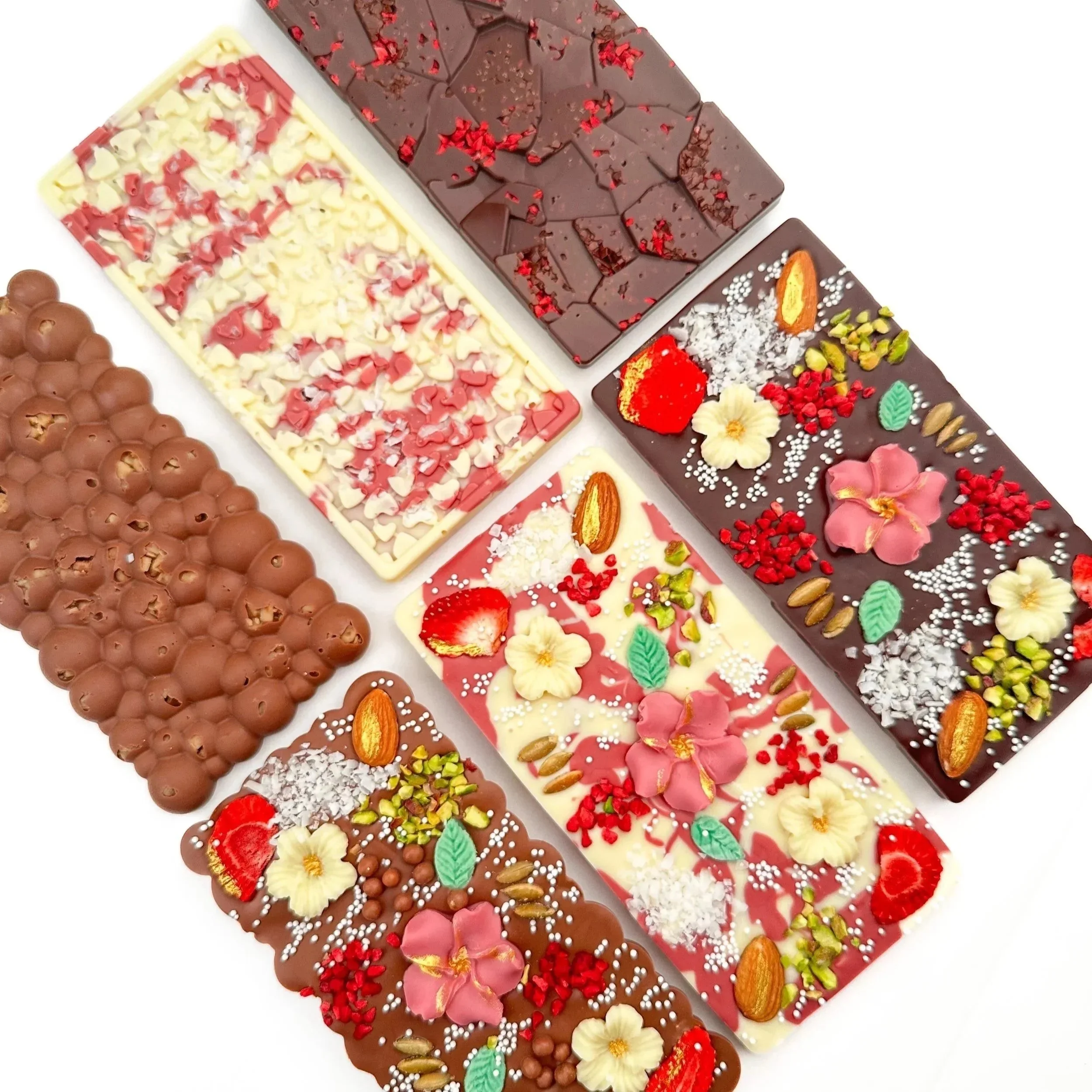 Our Chocolate Blossoms are a taste of art and love. Each one is handcrafted with care, filled with flavors to surprise and delight: Dark Chocolate with freeze-dried raspberry pieces, Smooth Milk Chocolate with chia seeds, and the fusion of creamy White Chocolate and Ruby Chocolate with dried coconut.