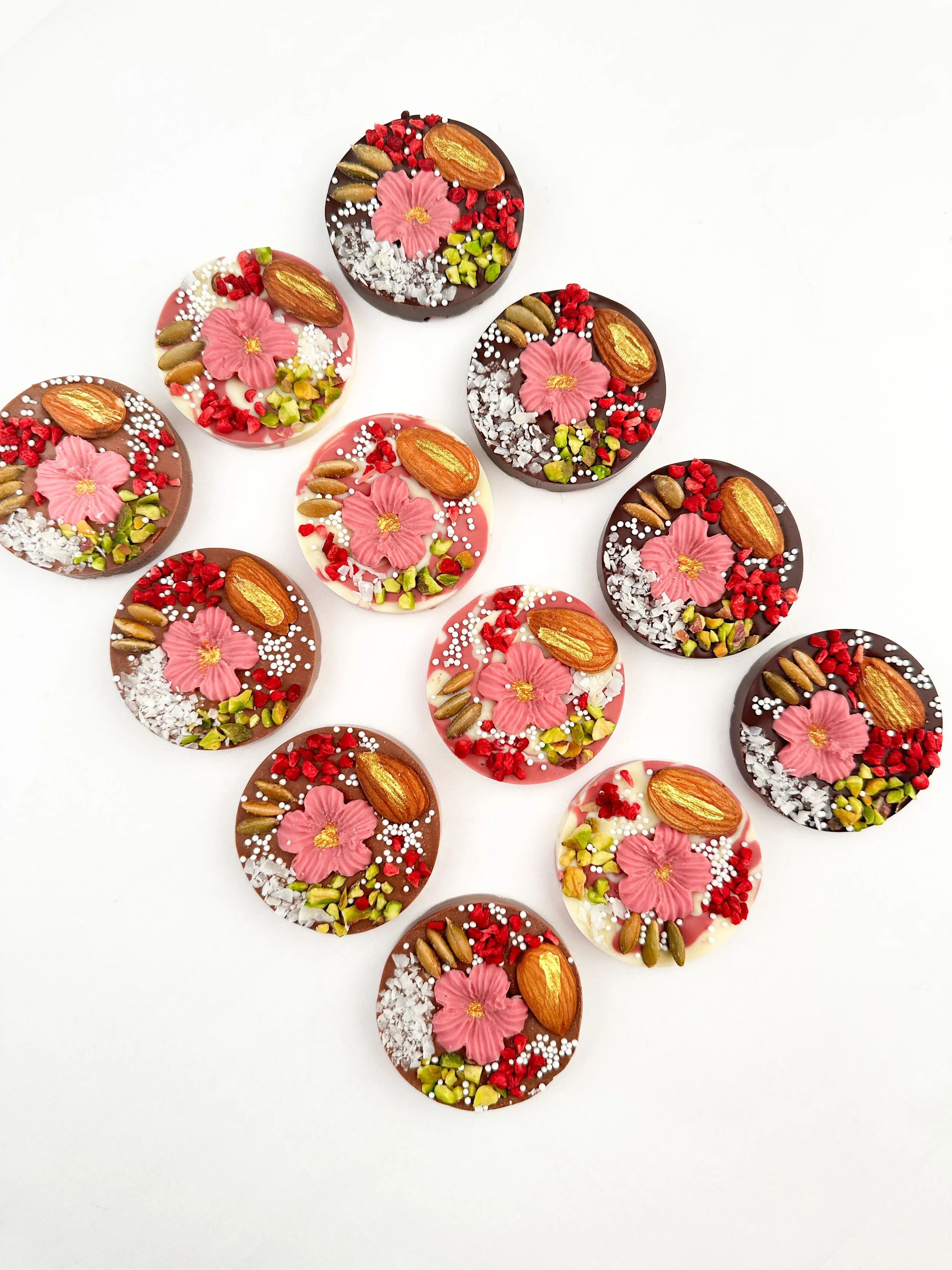 Topped with almonds, pistachios, pumpkin seeds, dried coconut, and freeze-dried strawberries/raspberries, every piece is decorated like a tiny edible garden. Perfect to share, to give, or to enjoy just for yourself, Chocolate Blossoms are a sweet reminder that life’s most beautiful moments are made with love.